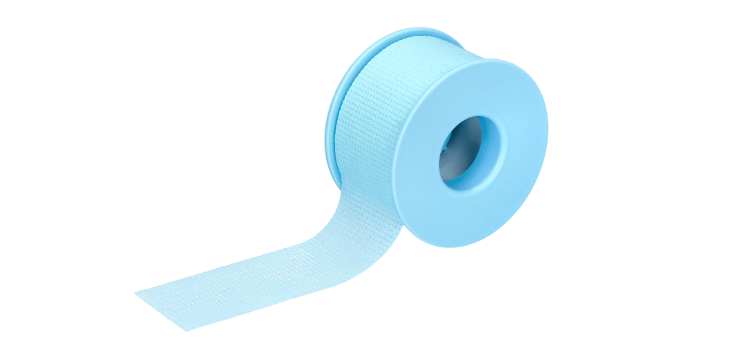 przylepiec włókninowy z perforacją ułatwiająca dzielenie, występujący w różnych kolorach i szerokościach, pokryty hipoalergicznym klejem silikonowym, nawinięty na szpulkę.
